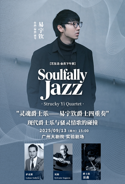 广州大剧院特别邀请青年作曲家、钢琴家易宇钦携手三位来自中美的国际音乐家Lukas Gabric(萨克斯)、 Sylvain Gagnonn(贝斯)、聂鑫(爵士鼓)组成的爵士四重奏,将在这个秋天,为实验剧场带来一场兼具创造性、哲思性与时代感的爵士专场。